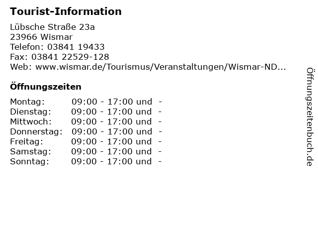 | Öffnungszeiten Tourist-Information in Wismar anzeigen | |