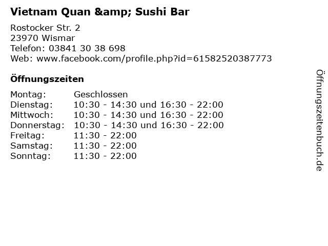 | Öffnungszeiten Vietnam Quan & Sushi Bar in Wismar anzeigen | |