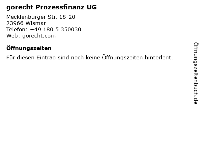 | Öffnungszeiten gorecht Prozessfinanz UG in Wismar anzeigen | |