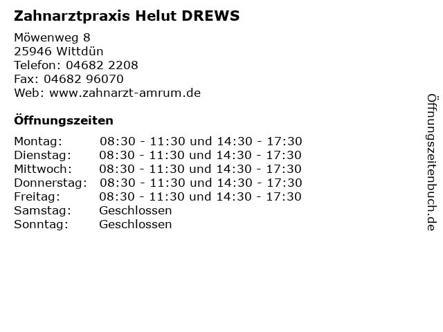 | Öffnungszeiten Zahnarztpraxis Helut DREWS in Wittdün anzeigen | |