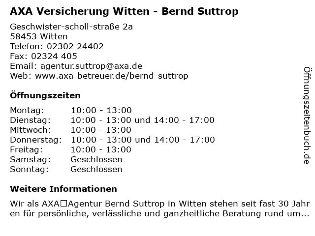 1 AXA Generalvertretung Suttrop & Hartke oHG (Entfernung: 0,02 km) Geschwister-Scholl-Str. 2a, 58453 Witten 2 5 Oliver Krauleidies AXA Versicherungsagentur (Entfernung: 5,38 km) Baroper Bahnhofstr. 15, 44225 Dortmund 6 |