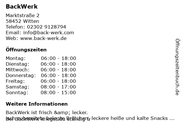 | Öffnungszeiten BackWerk in Witten anzeigen | |