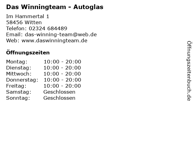 | Öffnungszeiten Das Winningteam - Autoglas in Witten anzeigen | |