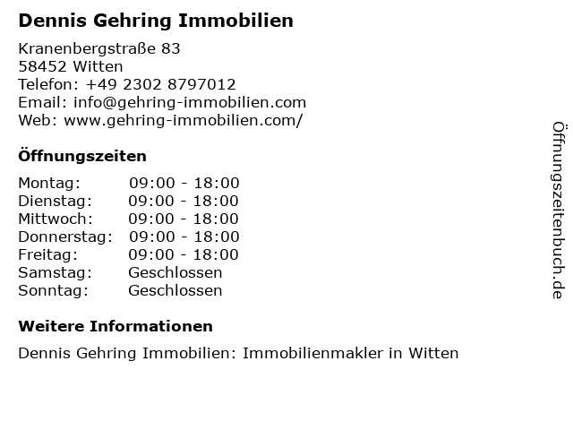 | Öffnungszeiten Dennis Gehring Immobilien in Witten anzeigen | |