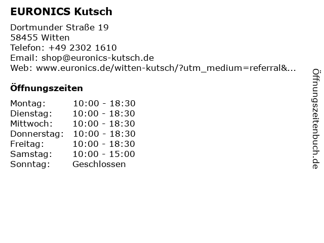 | Öffnungszeiten EURONICS Kutsch in Witten anzeigen | |