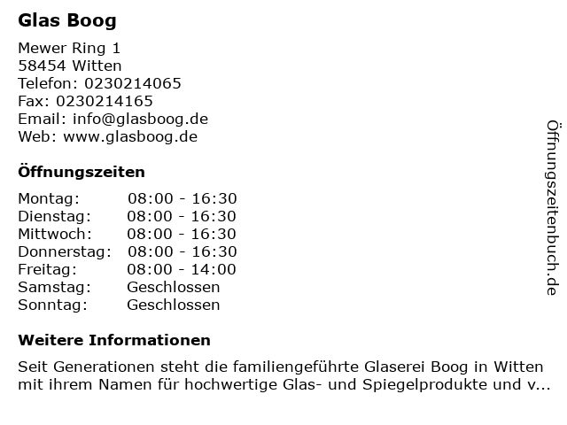| Öffnungszeiten Glas Boog in Witten anzeigen | |