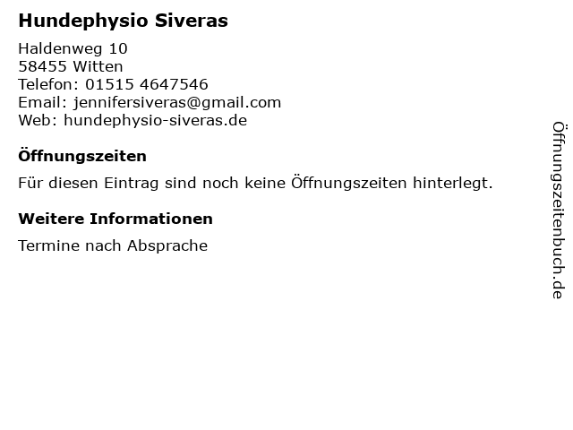 | Öffnungszeiten Hundephysio Siveras in Witten anzeigen | |