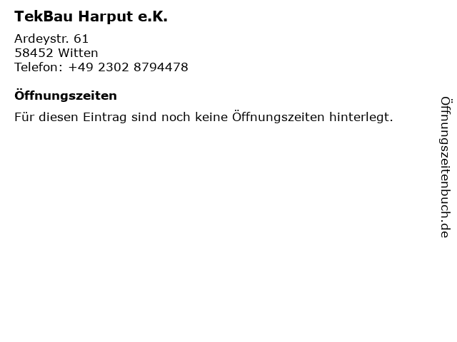 | Öffnungszeiten TekBau Harput e.K. in Witten anzeigen | |