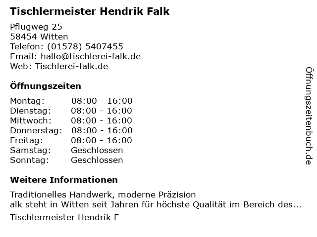 | Adresse Tischlermeister Hendrik Falk in Witten anzeigen |