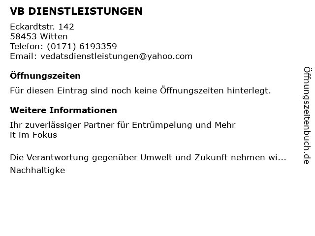 | Öffnungszeiten VB DIENSTLEISTUNGEN in Witten anzeigen | |