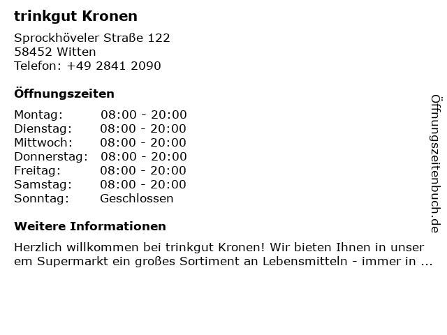 | Öffnungszeiten trinkgut Kronen in Witten anzeigen | |