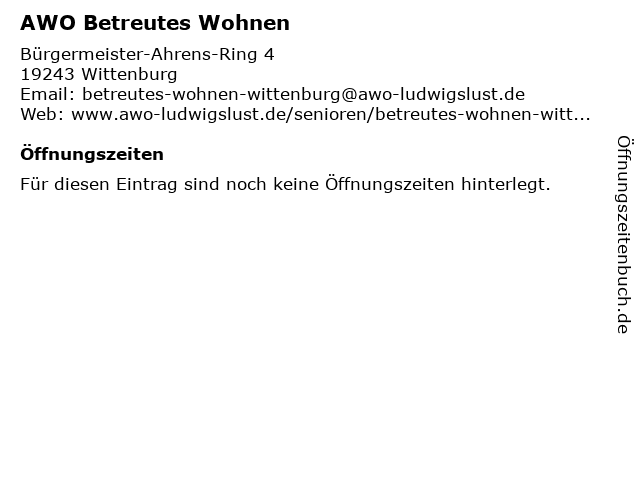 | Öffnungszeiten AWO Betreutes Wohnen in Wittenburg anzeigen | |