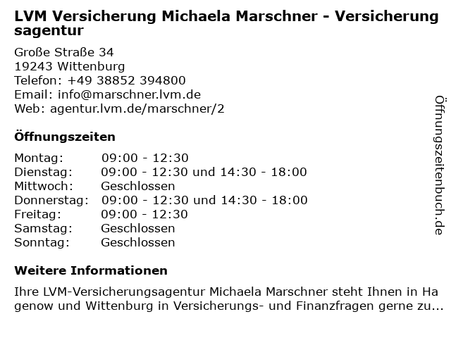 1 LVM Versicherung Michaela Marschner - Versicherungsagentur (Entfernung: 11,93 km) Lindenplatz 4, 19230 Hagenow 3 SIGNAL IDUNA Versicherung Kai-Uwe Wagner - Versicherungsagentur (Entfernung: 0,57 km) Demmlerstr. 10, 19243 Wittenburg 5 LVM Versicherung Rüdiger Medzech - Versicherungsagentur (Entfernung: 11,35 km) Hauptstraße 7, 19246 Zarrentin am Schaalsee 6 |