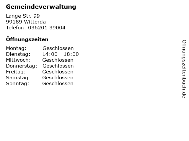 | Öffnungszeiten Gemeindeverwaltung in Witterda anzeigen | |