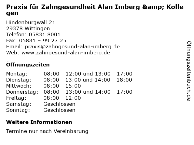 1 ETL Oehlmann Aspeir & Kollegen GmbH Steuerberatungsgesellschaft Niederlassung Bad Bodenteich (Entfernung: 12,64 km) Bahnhofsstraße 1, 29389 Bad Bodenteich 3 Praxis für Zahngesundheit Alan Imberg und Kollegen (Entfernung: 19,89 km) Alte Heerstr. 22, 29392 Wesendorf 4 Praxis für Zahngesundheit Alan Imberg & Kollegen (Entfernung: 27,07 km) Hauptstraße 4, 29556 Suderburg 6 |