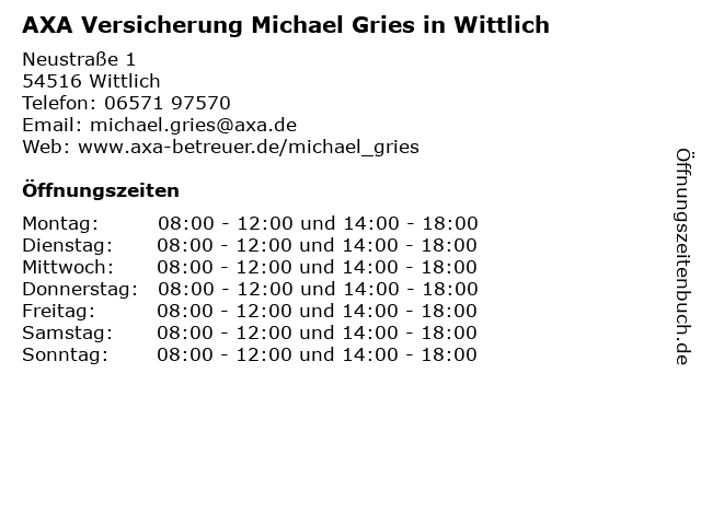 1 AXA Versicherung - Generalvertretung Juergen Wallerius (Entfernung: 0,13 km) Feldstr. 3, 54516 Wittlich 2 6 |