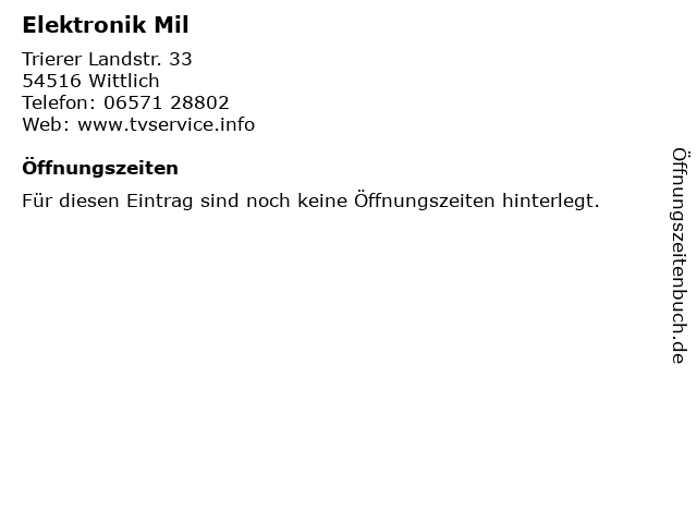 | Öffnungszeiten Elektronik Mil in Wittlich anzeigen | |