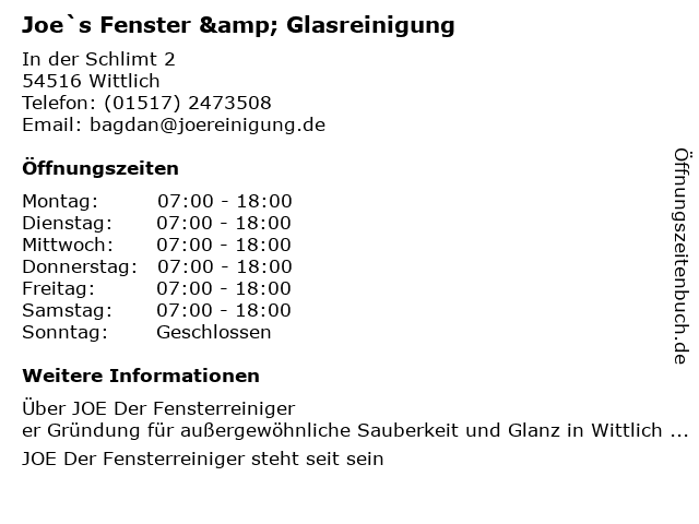 Branchen & Suchbegriffe zu Joe`s Fenster & Glasreinigung:fenster, fensterputzer, glasreinigung, jalousienreinigung, joe`s, raffstore-reinigungen, reinigung von glasdächern, reinigung von glasfronten, schaufensterreinigung, wintergartenreinigung |