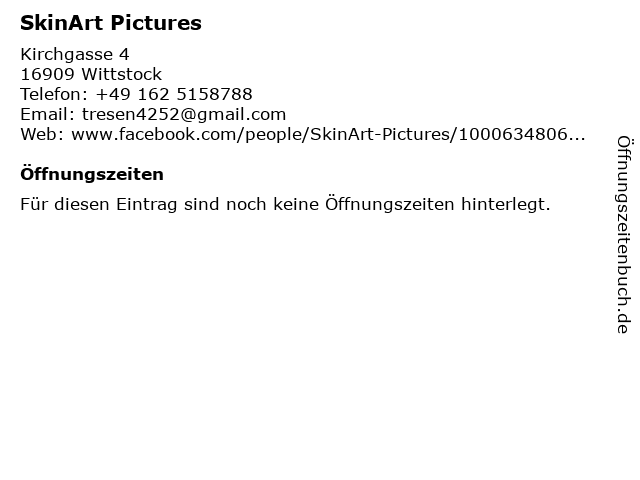 | Öffnungszeiten SkinArt Pictures in Wittstock anzeigen | |