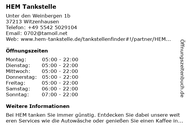 | Öffnungszeiten HEM Tankstelle in Witzenhausen anzeigen | |