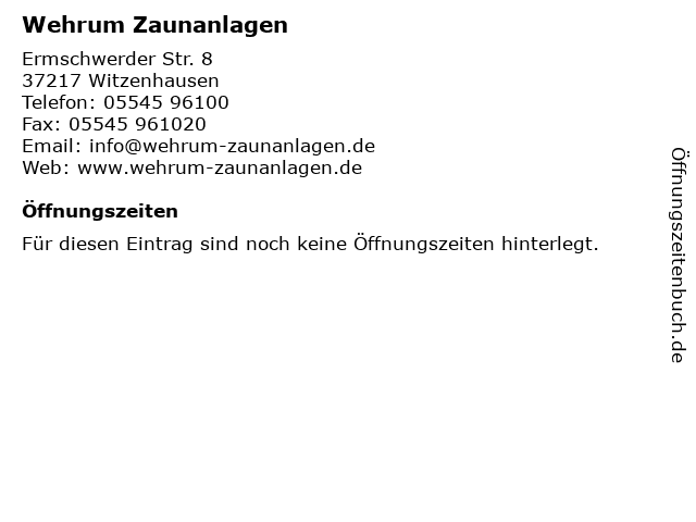 | Öffnungszeiten Wehrum Zaunanlagen in Witzenhausen anzeigen | |