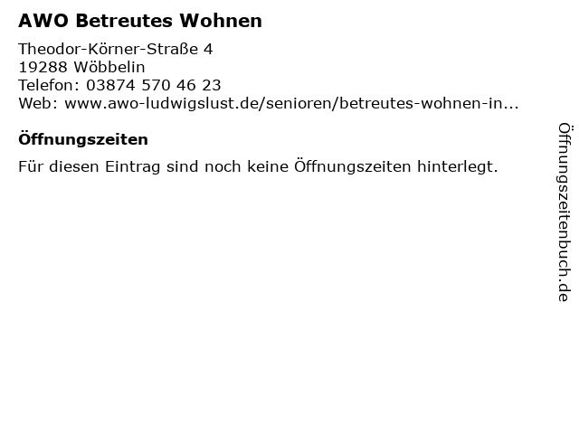 | Öffnungszeiten AWO Betreutes Wohnen in Wöbbelin anzeigen | |