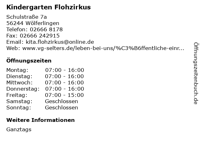 | Öffnungszeiten Kindergarten Flohzirkus in Wölferlingen anzeigen | |