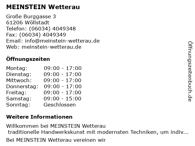 | Öffnungszeiten MEINSTEIN Wetterau in Wöllstadt anzeigen | |