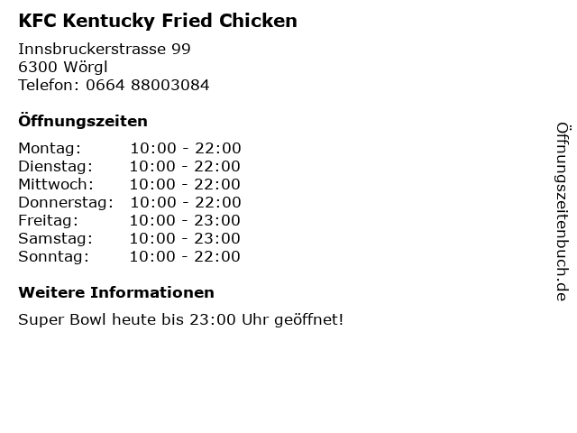 | Öffnungszeiten KFC Kentucky Fried Chicken in Wörgl anzeigen | |