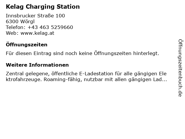 | Öffnungszeiten Kelag Charging Station in Wörgl anzeigen | |