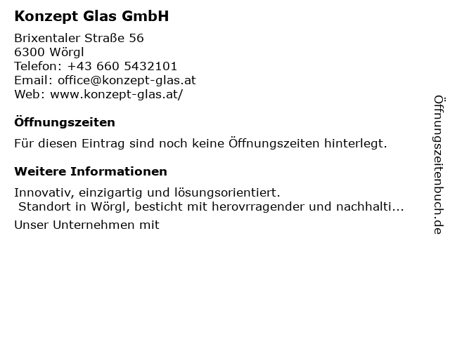 | Öffnungszeiten Konzept Glas GmbH in Wörgl anzeigen | |