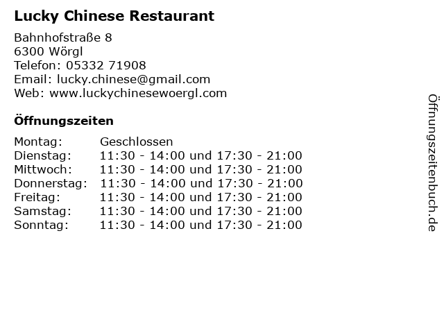 | Öffnungszeiten Lucky Chinese Restaurant in Wörgl anzeigen | |