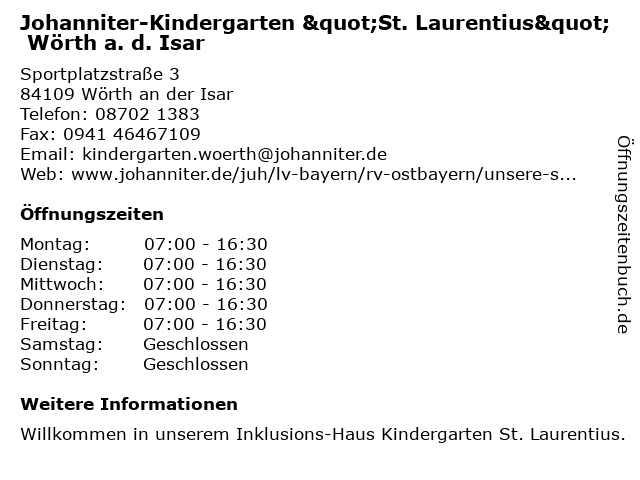 Branchen & Suchbegriffe zu Johanniter-Kindergarten "St. Laurentius" Wörth a. d. Isar:"st., a., agentur für kinderbetreuung, d., gemeinnützige organisation, hilfsorganisation, isar, johanniter, kindergarten, laurentius", sozialarbeit, verband, wohlfahrtseinrichtung |