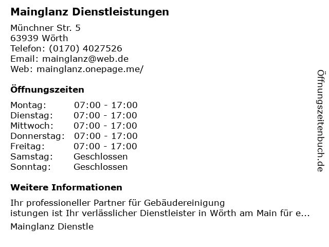 | Öffnungszeiten Mainglanz Dienstleistungen in Wörth anzeigen | |