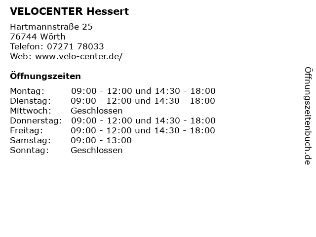 | Öffnungszeiten VELOCENTER Hessert in Wörth anzeigen | |