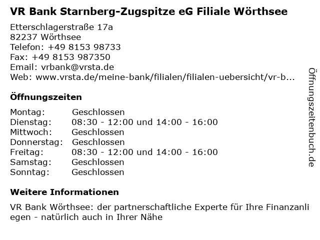 Branchen & Suchbegriffe zu VR Bank Starnberg-Zugspitze eG Filiale Wörthsee:altersvorsorge, bank, baufinanzierung, bausparen, beratung, eg, geldanlage, girokonto, kredit, kreditkarte, versicherung, vr, wörthsee, zugspitze |