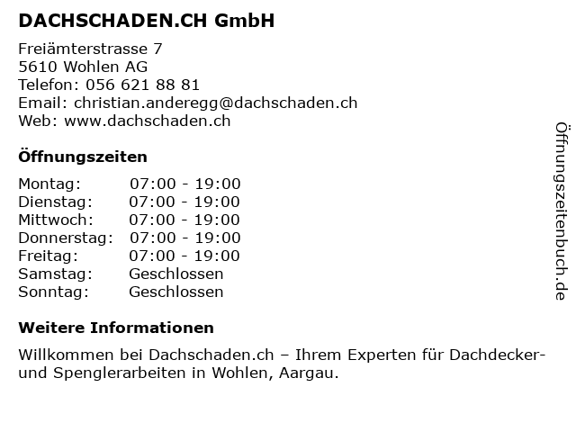 | Öffnungszeiten DACHSCHADEN.CH GmbH in Wohlen AG anzeigen | |