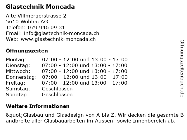 | Öffnungszeiten Glastechnik Moncada in Wohlen AG anzeigen | |
