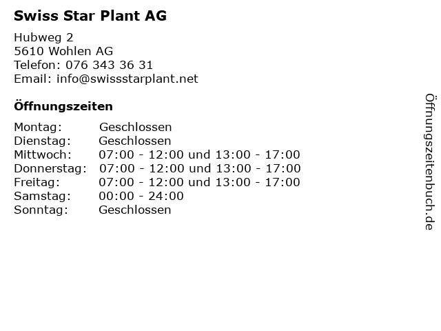 | Öffnungszeiten Swiss Star Plant AG in Wohlen AG anzeigen | |