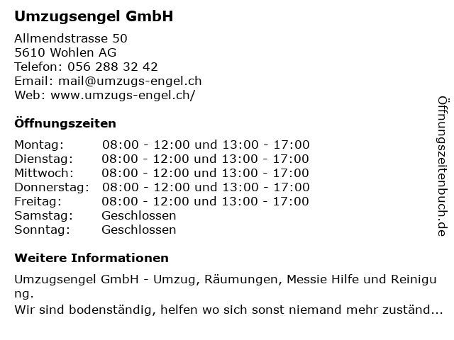 Öffnungszeiten Umzugsengel GmbH in Wohlen AG anzeigen | |