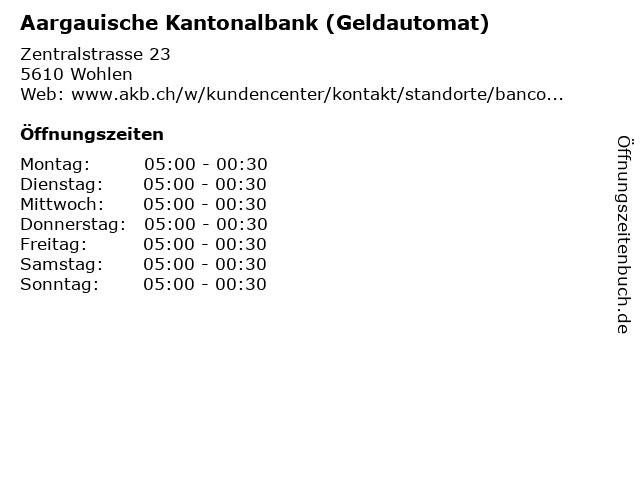 | Öffnungszeiten Aargauische Kantonalbank (Geldautomat) in Wohlen anzeigen | |