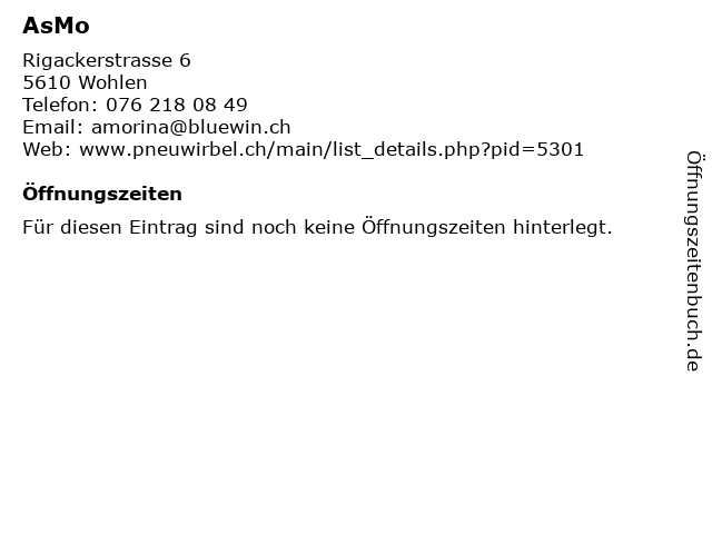 | Öffnungszeiten AsMo in Wohlen anzeigen | |
