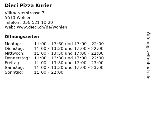 | Öffnungszeiten Dieci Pizza Kurier in Wohlen anzeigen | |