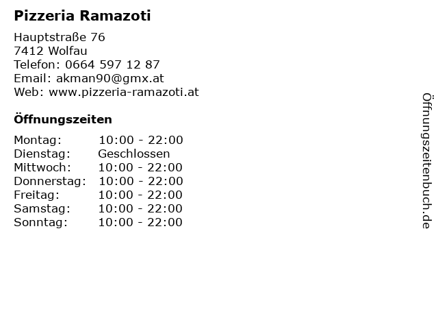 | Öffnungszeiten Pizzeria Ramazoti in Wolfau anzeigen | |