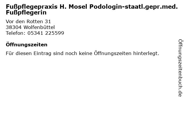 | Fußpflegepraxis H. Mosel Podologin-staatl.gepr.med.Fußpflegerin anrufen | |