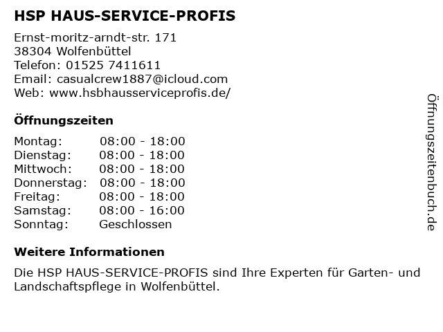 Öffnungszeiten HSP HAUS-SERVICE-PROFIS in Wolfenbüttel anzeigen | |