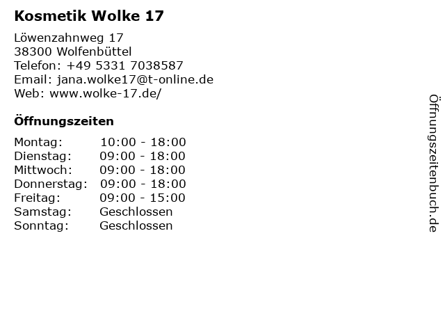 | Öffnungszeiten Kosmetik Wolke 17 in Wolfenbüttel anzeigen | |