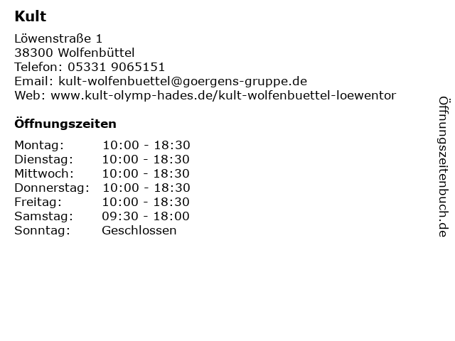 | Öffnungszeiten Kult in Wolfenbüttel anzeigen | |