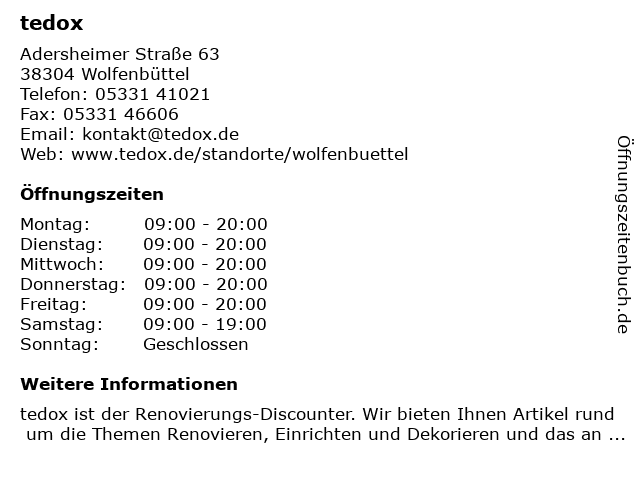 | Öffnungszeiten tedox in Wolfenbüttel anzeigen | |