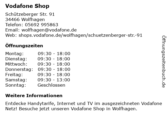 | Öffnungszeiten Vodafone Shop in Wolfhagen anzeigen | |